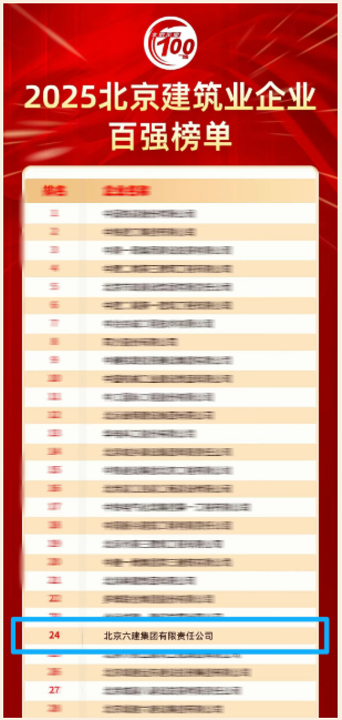 12月26日,六建集团再度荣登“北京建筑业企业百强”榜单,实现连续三年登榜,排名从第26名稳步攀升至第24名,位次跃升2位,进一步彰显了公司在行业中的持续竞争力与良好发展态势。